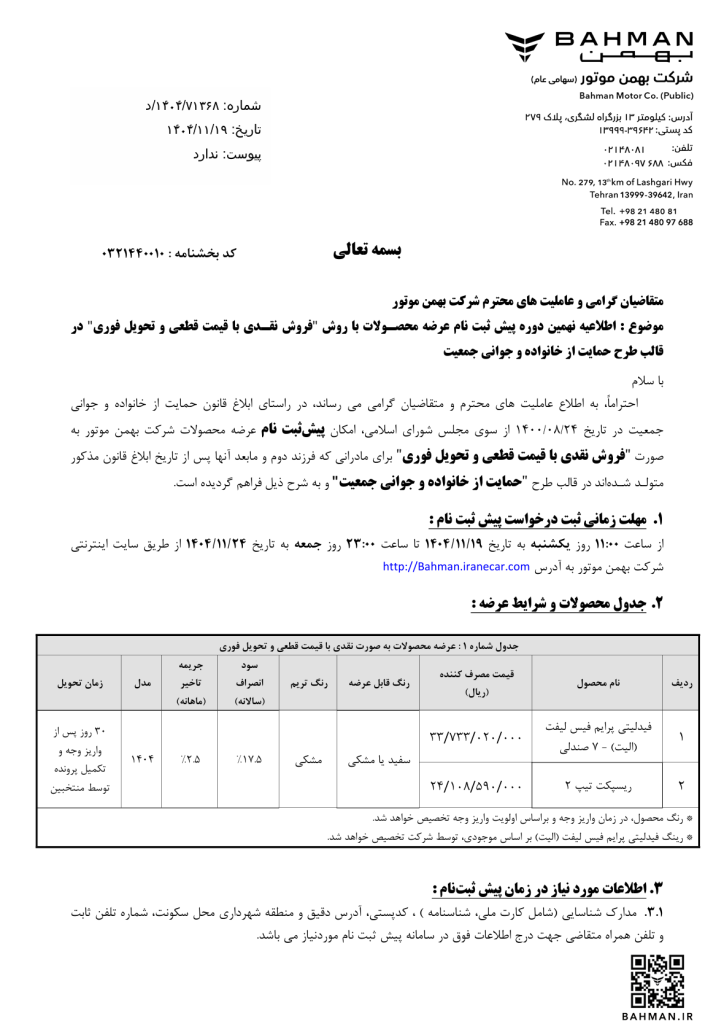 گروه بهمن شرایط فروش فوری دو محصول فیدلیتی الیت تیپ ۲ هفتنفره و ریسپکت ۲ را ویژه بهمنماه ۱۴۰۴ منتشر کرد. این بخشنامه فروش با قیمتهای نهایی جدید ارائه شده و شامل دو طرح «عادی» و «حمایت از خانواده و جوانی جمعیت» است.
