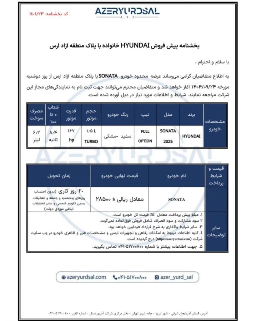 شرکت آذریوردسال با انتشار اطلاعیهای رسمی، شرایط فروش هیوندای سوناتا مدل ۲۰۲۵ را ویژه متقاضیان منطقه آزاد ارس اعلام کرد. این خودرو با قیمت ۲۸ هزار و ۵۰۰ دلار و موعد تحویل ۲۰ روز کاری در اختیار خریداران قرار میگیرد.