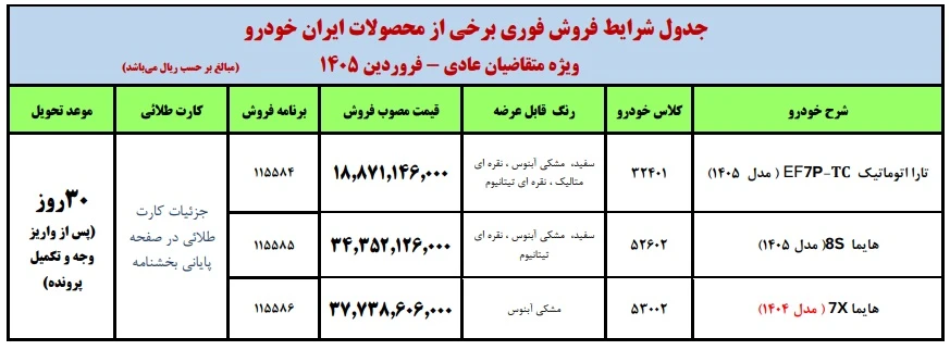 براساس اعلام شرکت ایران‌خودرو، فروش فوری محصولات تارا اتوماتیک EF7 P توربو شارژ، هایما ۸ اس و هایما ۷ ایکس از روز شنبه ۲۹ فروردین ماه آغاز می‌شود. در این طرح، موعد تحویل خودروها ۳۰ روزه تعیین شده و قیمت خودرو بر اساس قیمت مصوب زمان ثبت‌نام محاسبه خواهد شد.