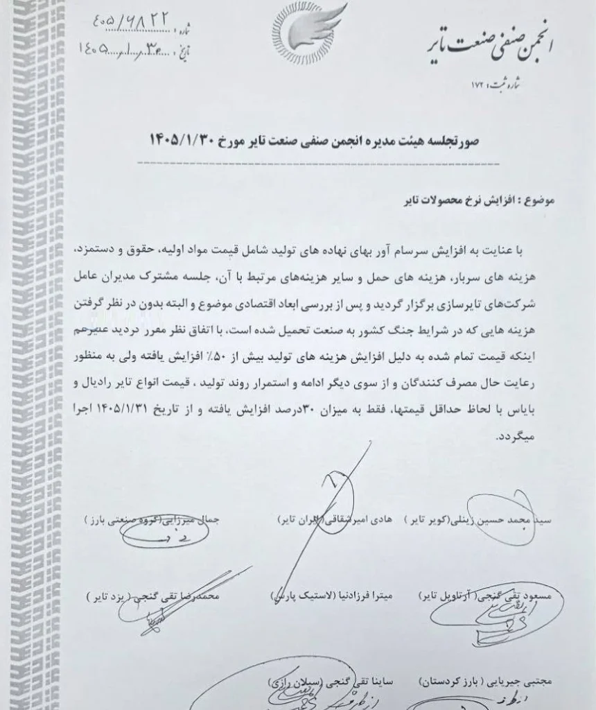 قیمت لاستیک خودرو توسط تایرسازان داخلی از امروز دوشنبه 31 فروردین ماه 1405 با 30 درصد افزایش قیمت‌گذاری شد.