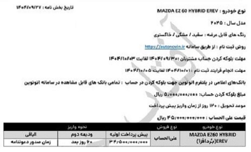 فروش جدید EZ-60 Hybrid EREV (EZ-6) از روز دوشنبه بهصورت رسمی در پلتفرم اتونوین آغاز میشود. عرضهای که نهتنها پای یکی از جدیدترین محصولات مزدا را به بازار ایران باز میکند، بلکه نشاندهنده تغییر مسیر عرضه خودروهای وارداتی خاص در کشور است.
