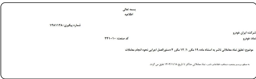 به گزارش خودرومدیا به نقل از تسنیم، شرکت بورس تهران با صدور اطلاعیه‌ای اعلام کرد: به اطلاع فعالان بازار می‌رساند طبق اطلاعیه منتشره در سامانه کدال (سامانه شفاف‌سازی شرکت‌های بورسی) جهت بررسی وضعیت اطلاعاتی ناشر، نماد معاملاتی شرکت ایران‌خودرو (خودرو) حداکثر تا تاریخ ۱۸ بهمن امسال تعلیق شد.