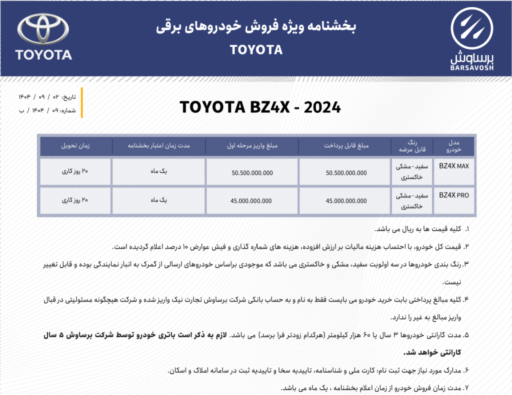 شرکت برساوش شرایط فروش جدید تویوتا bZ4X را برای هر دو تیپ PRO و MAX با مدل ۲۰۲۴، تحویل ۲۰ روزه و قیمت قطعی اعلام کرده است؛ طرحی که بعد از بررسی جزئیات آن، بسیاری از خریداران آن را «غیرمنطقی» و «گران» می‌دانند.