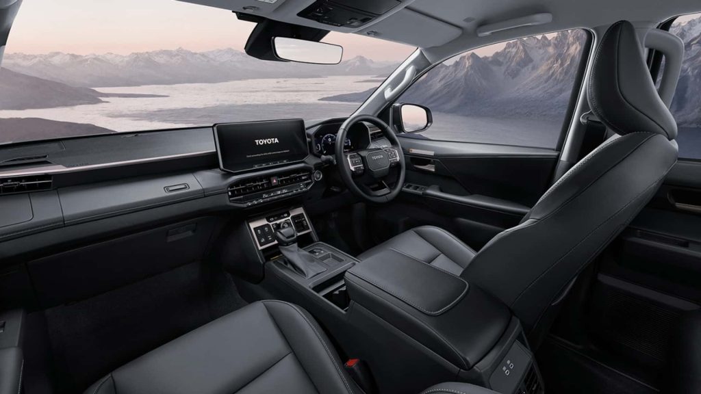 در فضای داخلی، هایلوکس بیش از هر زمان دیگری به لندکروزر نزدیک شده است. طراحی داشبورد حالا مدرنتر و منظمتر است و از نمایشگر لمسی ۱۲.۳ اینچی و پنل دیجیتال ۱۲.۳ اینچی بهره میبرد (در تیپهای پایه ۷ اینچ). استفاده از دکمههای فیزیکی و فرمان الهامگرفته از لندکروزر، حس قدرت و تسلط را افزایش داده است. امکانات ایمنی و کمکراننده نیز در سطح خودروهای سواری مدرن تویوتا ارتقا یافتهاند.